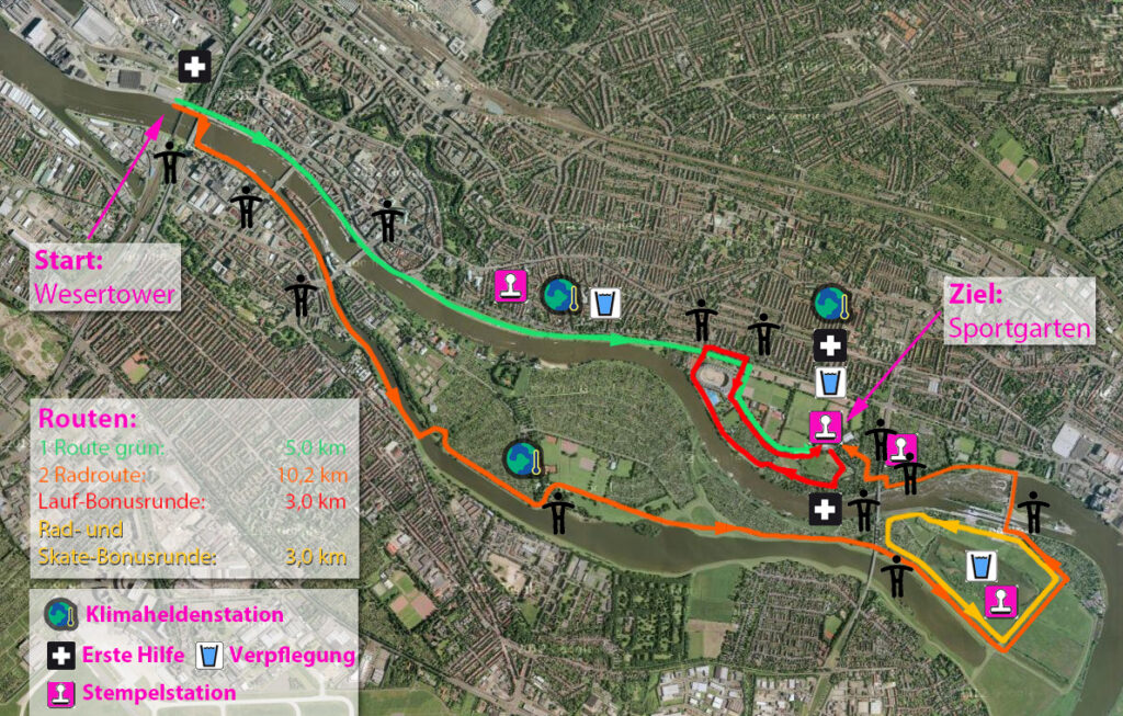 Alle Strecken starten am Wesertower, am Ende der Schlachte in der Überseestadt und enden im Sportgarten in der Pauliner Marsch. Je nach Bewegungsform führen die Strecken entlang der Schlachte vorbei am Weserstadion in die Pauliner Marsch oder über die Stephanibrücke zur Werderinsel und über das Weserwehr zurück zum Sportgarten. Die Laufstrecke ist 5 km lang, die Radstrecke 10,5 km und können jeweils durch Extra-Runden oder durch Bonus-Runden verlängert werden.